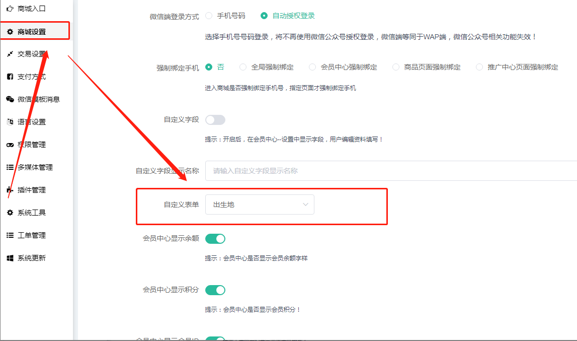 通过后台应用--自定义表单插件--创建表单信息,返回系统--商城设置--会员--自定义表单处勾选好相应的表单信息,会员在前端会员中心--设置--绑定手机页面便能看到。