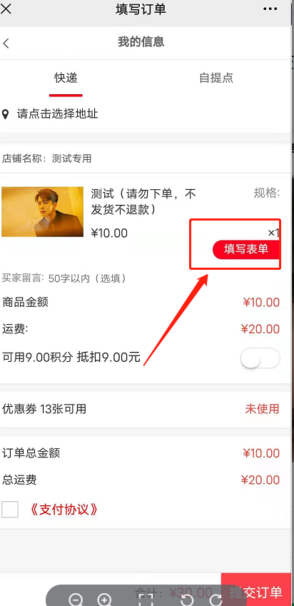 会员前端购买该商品需要填写好表单信息提交成功之后,才能提交订单购买商品