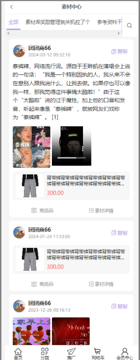 4,前端会员中心—素材中心,点击进去可以查看到后台发布的素材,前端会显示素材文案,素材商品图片,关联的商品