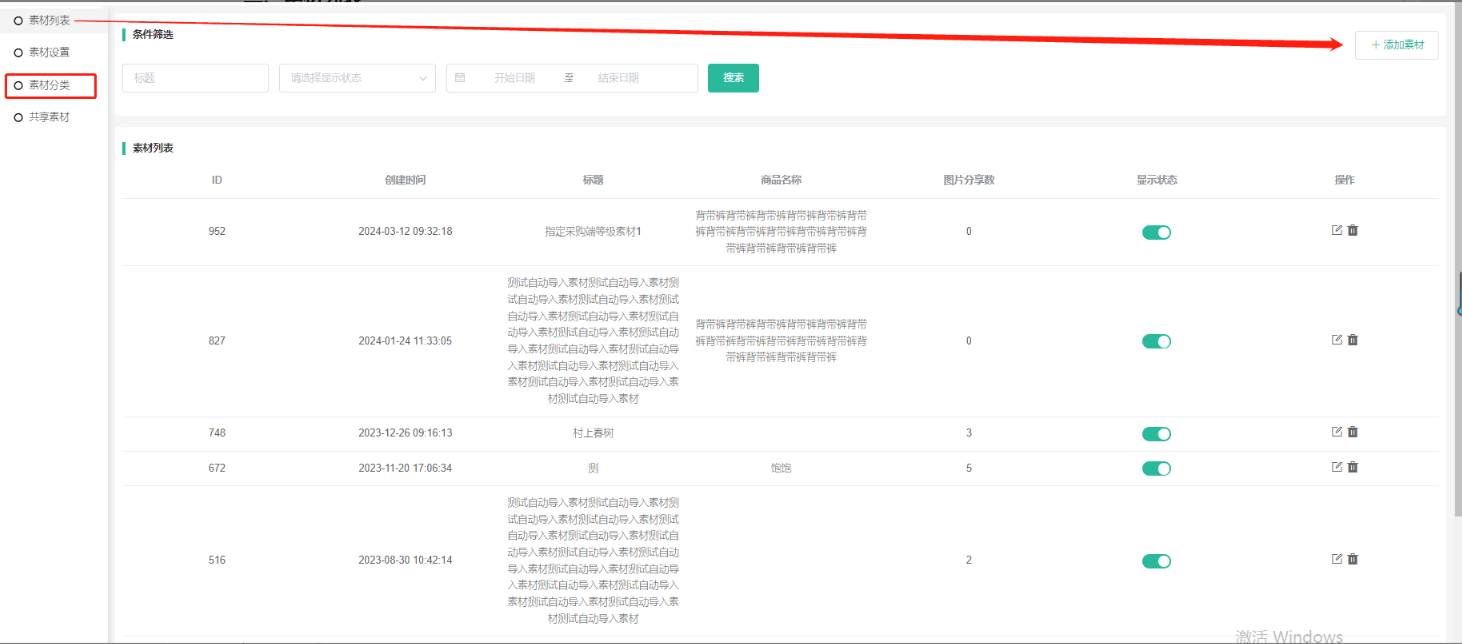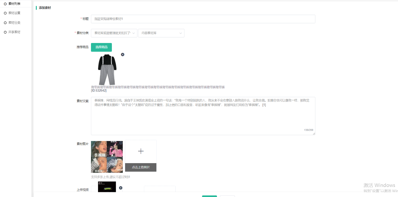 1.素材列表添加素材:设置好素材标题,关联的商品只能选择一件(支持平台所有商品),素材文案,上传好商品图片(图片最多只能上传9张),选择是否显示(选择显示则保存后在前端就可以查看到)