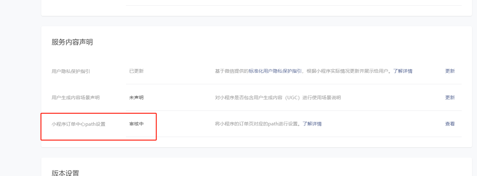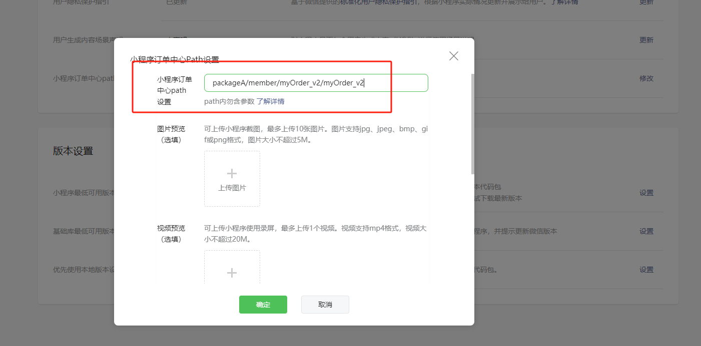 路径一:新注册或有更新需求的小程序,在小程序平台 -- 版本管理 -- 提交审核,在代码提审环节设置订单中心path,填写: packageA/member/myOrder_v2/myOrder_v2