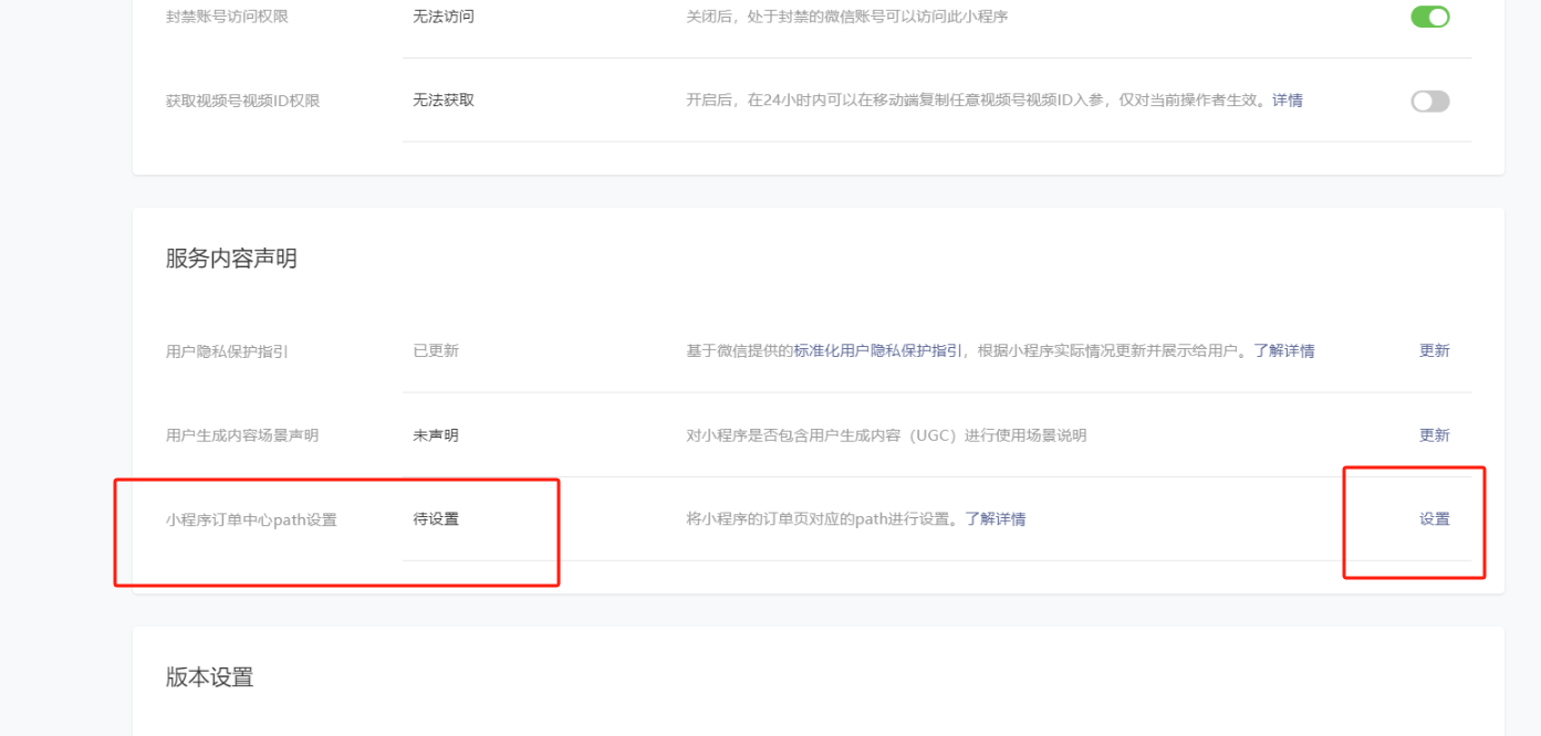 路径二:在小程序平台 -- 设置 -- 基本设置 -- 功能设置 -- 订单中心path设置入口进行设置,填写:packageA/member/myOrder_v2/myOrder_v2