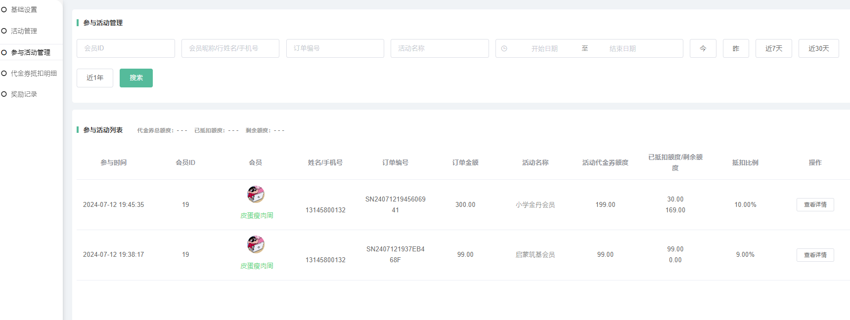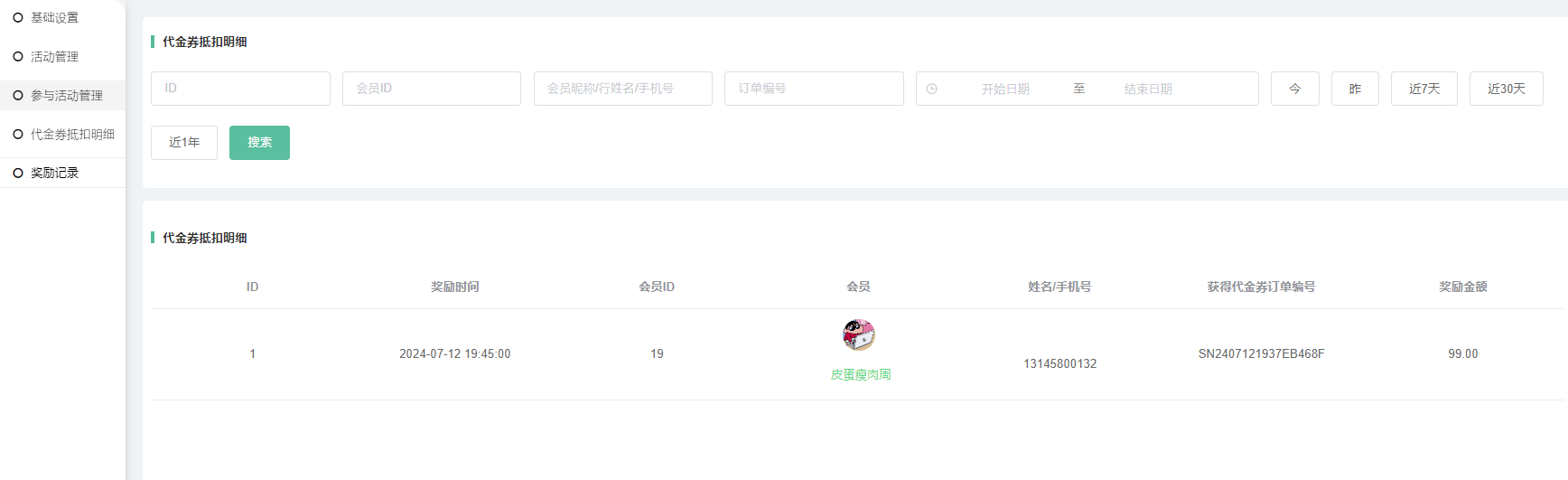 1,新增活动:设置活动名称、消费区间金额、代金券金额、每次抵扣金额、奖励金额