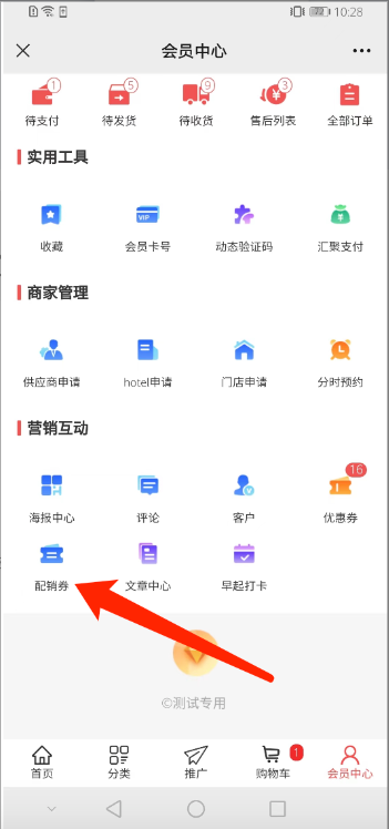 (一)会员中心--营销互动--显示“配销券”入口。系统页面会自带,也可后台通过装修会员中心勾选显示。