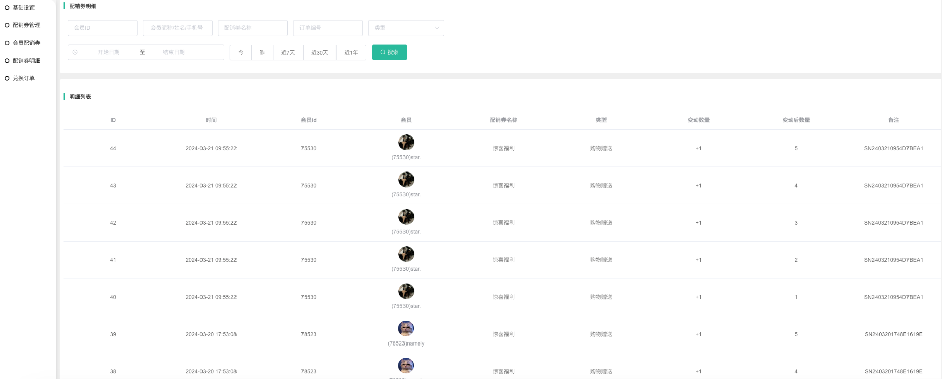 1、按照会员显示配销券。配销券总量包含过期的配销券。会员购买商品获得配销券,或者是后台手动发放,会员配销券列表会有相关显示。
