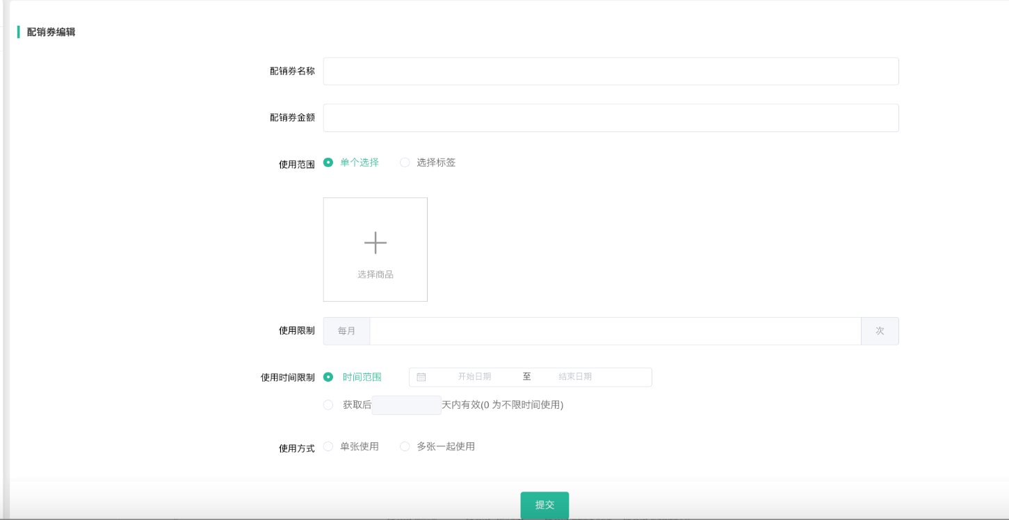 1、后台添加配销券,设置配销券金额、使用规则(每月只能使用1张,或者可一次性使用多张),选择购买指定商品赠送相应配销券.