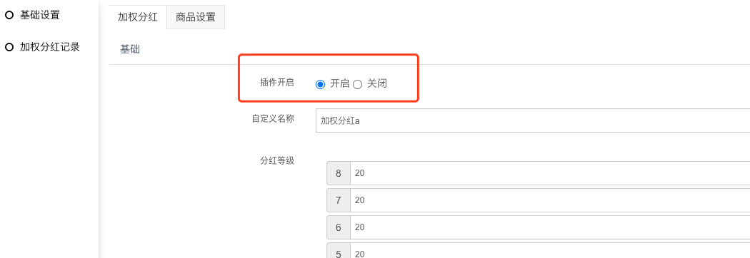 1) 开启加权分红,关闭后不分红,并且前端推广中心处不显示加权分红