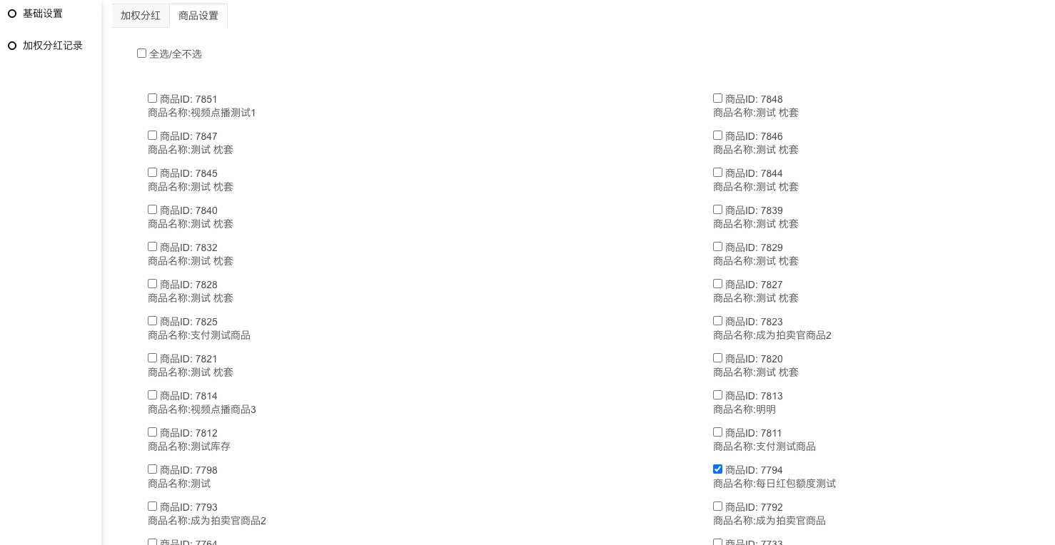 4) 商品设置:只有勾选了的商品才会参与加权分红,若此处未勾选,商品开启了独立设置也不会参与加权分红