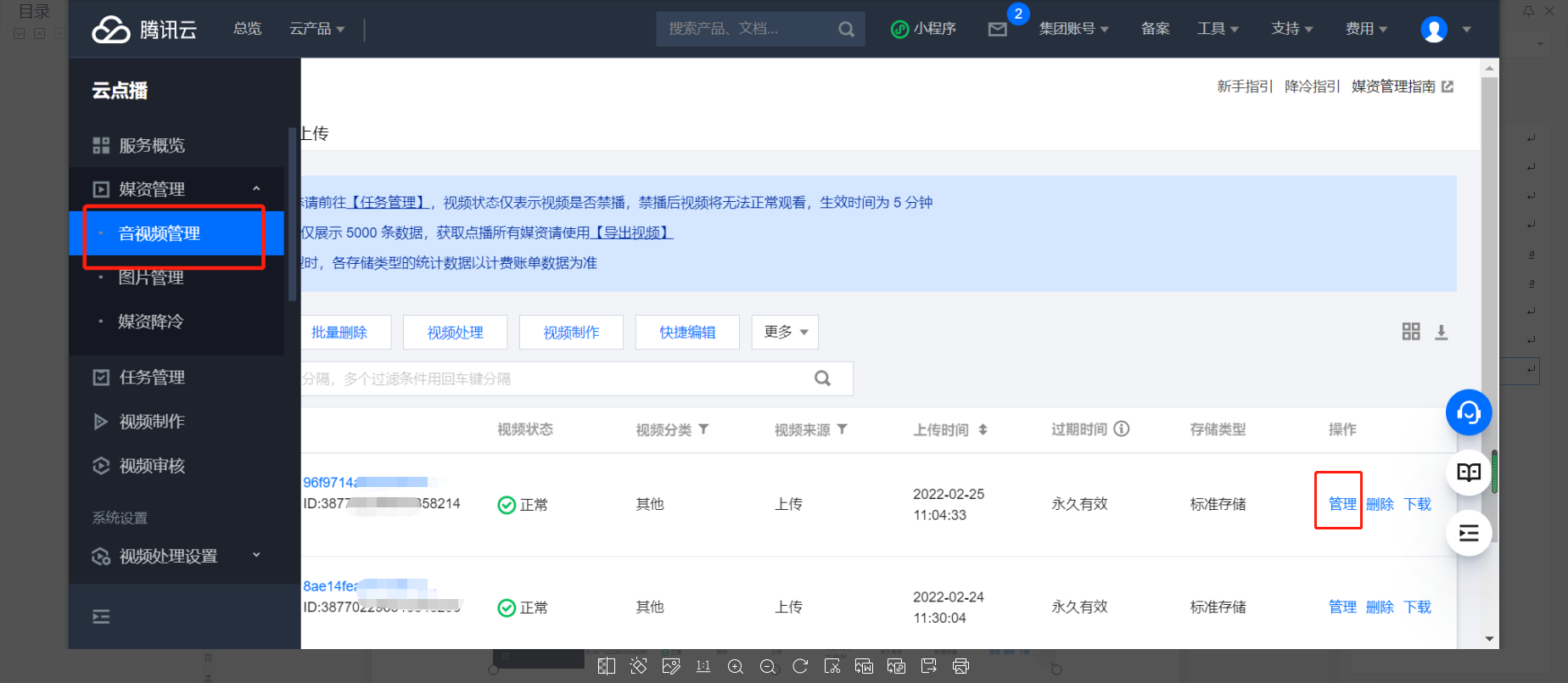 登陆腾讯云账号-搜索云点播-视频管理-上传音视频