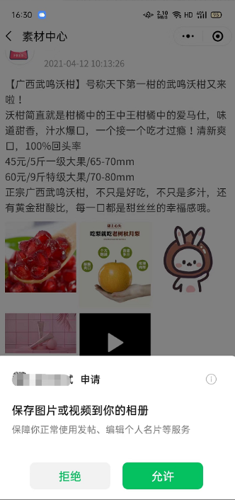 4,前端会员中心—素材中心,点击进去可以查看到后台发布的素材,前端会显示素材文案,素材商品图片,关联的商品
