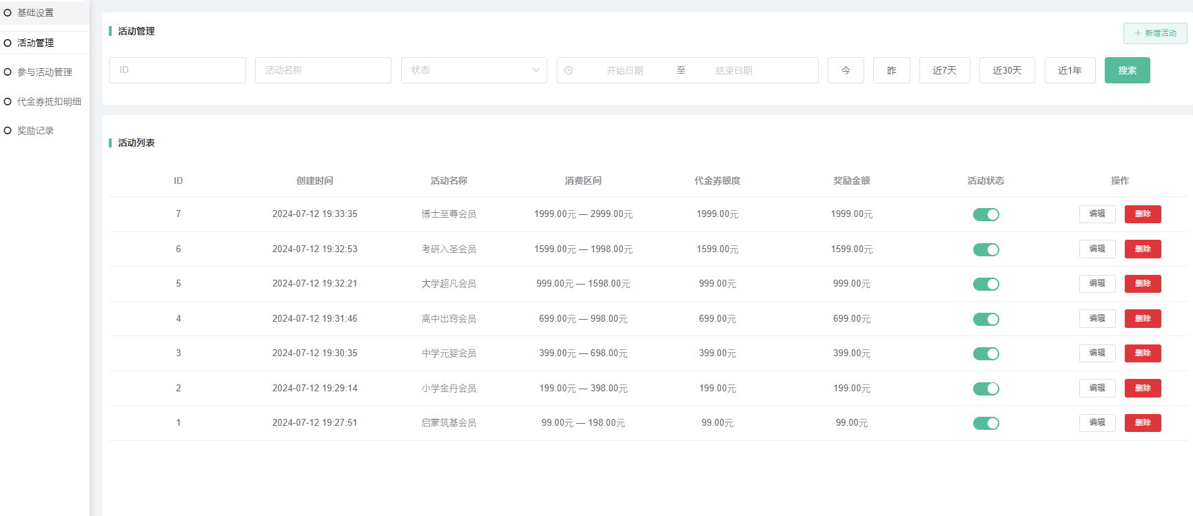 1,新增活动:设置活动名称、消费区间金额、代金券金额、每次抵扣金额、奖励金额